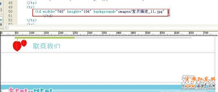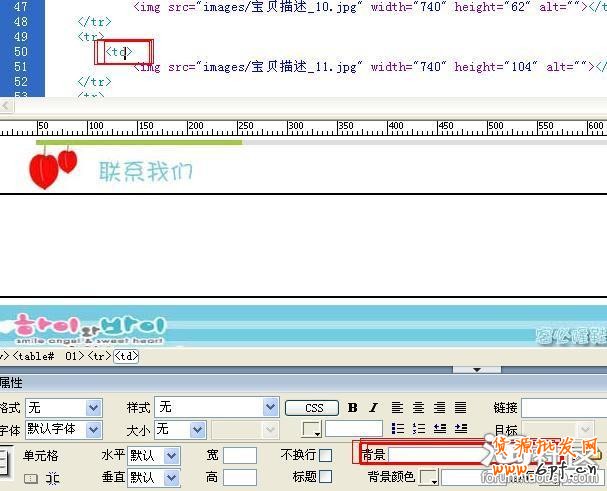 此時(shí)可以看到在屏幕下方出現(xiàn)單元格背景框。在背景框內(nèi)填入images/寶貝描述_11.gif,并在左邊設(shè)置寬為740,高為104,設(shè)置完畢之后,刪除單元格中的圖片,也即刪除<img src= “images/寶貝描述_11.jpg” width = “740” height = “104” alt=””>這一段代碼。最終如下圖所示: