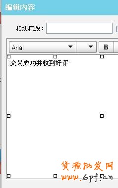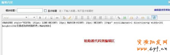 3、粘貼如下代碼(紅色部分,“交易成功并收到好評”為示例文字,后面會修改此文字)略去從Frontpage里編輯源代碼步驟,因為這個稍復雜。如果你對html源碼很精通,還可以打造出更漂亮的效果,比如加上寶貝圖片也是可以滾動的,鑒于此模塊寬度有限,就僅簡單弄上文字。愿旺鋪開發(fā)設(shè)計師設(shè)計一個可以自動調(diào)用的接口來實現(xiàn)這個效果就更好了。