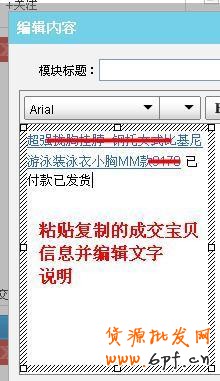 8、將復制的已成交寶貝信息粘貼到編輯框,并編輯相關(guān)文字說明(比如訂單xxx已付款,待發(fā)貨;訂單已發(fā)貨,待收貨;交易成功,待評價;交易成功并收到好評等等)
