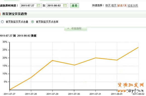 從上圖顯示的7.22~~7.27 一周首頁到寶貝頁點擊率在0~20%波動,呈起伏不定狀態(tài)。