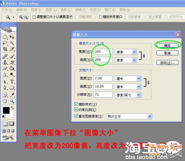 2.在菜單文件下拉“圖像大小”(快捷鍵Alt+Ctrl+I)彈出對(duì)話框(把三張圖片)寬度改為200像素,高度改為299像素,按確定
