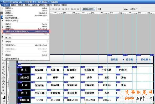 2. 分類導航圖片制作好之后,我們要把這些有鏈接的地方切成小圖,還是在PS里面哦。 Ctrl+R打開標尺,從里面拖出參考線,然后用切片工具切成我們想要的效果,如圖: