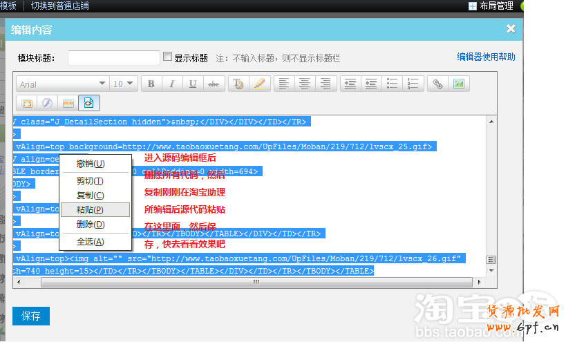 12:風(fēng)單擊右鍵全選所以字符,全部刪除,把在淘寶空間制作好的HTML源代碼復(fù)制粘貼到這里,點(diǎn)擊保存。