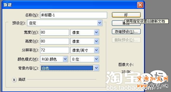 1、打開Photoshop 文件—新建一個圖層(按照下圖設置好)因為店鋪頭像要求尺寸要80*80的,所以我們必須要這樣設置。