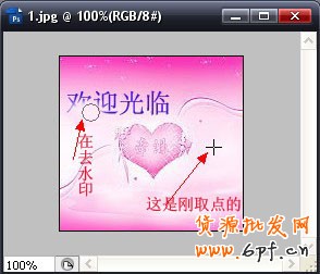 2): 按住ALT鍵--左鍵點擊取點(看看水印是覆蓋在什么顏色上的`我們就取什么顏色的點,這里我們先取白色為點)--松開ALT鍵--接著把水印去掉,如下圖:一定要仔細點``直到把相同的顏色水印去完!