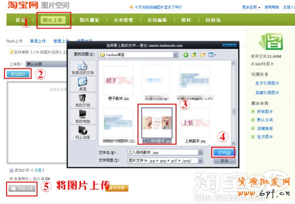 到淘寶免費提供的1G圖片空間里將圖片上傳。。(友善提醒:一鉆以前的“圖片空間”可以免費提供1G的空間哦,但是好像不接受外鏈,裝修店鋪的時候也是個可以利用的好地方~O(∩_∩)O。。)