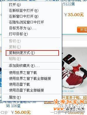 首先回到我們網店首頁所選寶貝所在位置。將鼠標移到寶貝下面的超鏈接上,點擊鼠標右鍵,彈出菜單,在彈出菜單中選擇“復制快捷方式”。