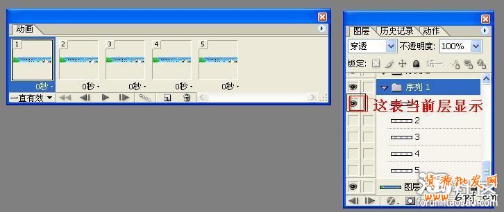 然后選中第一幀,在圖層中將每只海鷗的第一個圖層顯示,其余四層隱藏。第二幀中將每只海鷗的第二圖層顯示,其余四層隱藏。依次類推,直到將五幀都這樣設置完畢。如圖所示:
