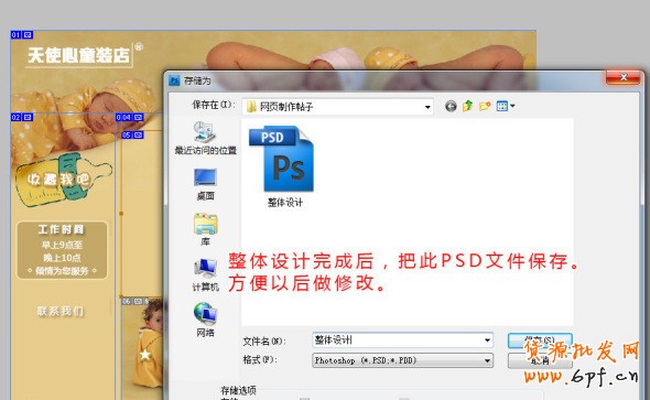 調整好圖片位置后先做些整體的設計,如加入店名、收藏我吧、工作時間等,也可以在適當的位置添加圖片,自我發揮吧。需要提醒的是,此步僅作靜態的設計,動畫設計等請不要在這步做出,待下面存儲為獨立的“店招”、“左側欄”和“自定義促銷欄”PSD文件后再編輯。