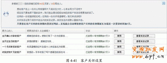 客戶(hù)關(guān)懷。淘寶網(wǎng)的網(wǎng)店版軟件還提供了客戶(hù)關(guān)懷功能,如圖4-41所示。只要選擇好要關(guān)心的客戶(hù)類(lèi)型,如當(dāng)天確認(rèn)付款的客戶(hù)、當(dāng)天過(guò)生日的顧客、一個(gè)月沒(méi)有聯(lián)系的顧客和收到商品7天還沒(méi)確認(rèn)收貨的客戶(hù),設(shè)置好要對(duì)他們說(shuō)的話,在預(yù)定時(shí)間就會(huì)通過(guò)阿里旺旺給相應(yīng)的客戶(hù)發(fā)送信息。