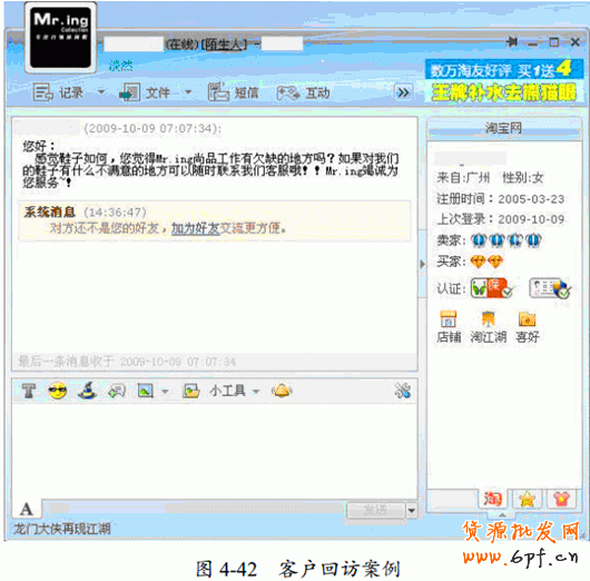 客戶(hù)回訪分為周期性回訪和節(jié)日回訪,如圖4-42所示的案例,商家進(jìn)行的是周期性回訪,詢(xún)問(wèn)客戶(hù)對(duì)商品和服務(wù)的感受,表達(dá)出良好的服務(wù)態(tài)度和職業(yè)精神。