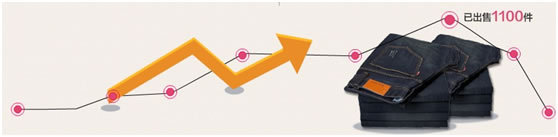 洛奇的一個業務經理推薦向謝生推薦了一款牛仔褲,不但拿出了款式,而且提供了這款牛仔褲的銷售數據。謝生在核對銷售數據后,果斷下單生產。這條牛仔褲也不負眾望,一般情況下每天能夠賣出150多條,銷量最高的一天(2011年12月10號)銷售了1100多條,成為韓帛伊品淘寶店的人氣爆款。