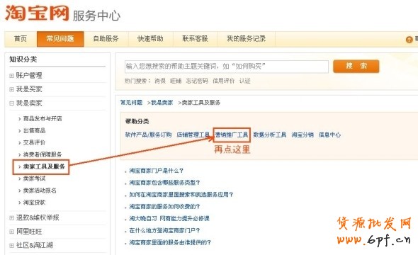 這是淘寶網的服條中心,相信很多親們都知道,對吧!然后因為我們是賣家,所以就得找到"我是賣家,再點右側處的"營銷推廣工具",看到了吧!