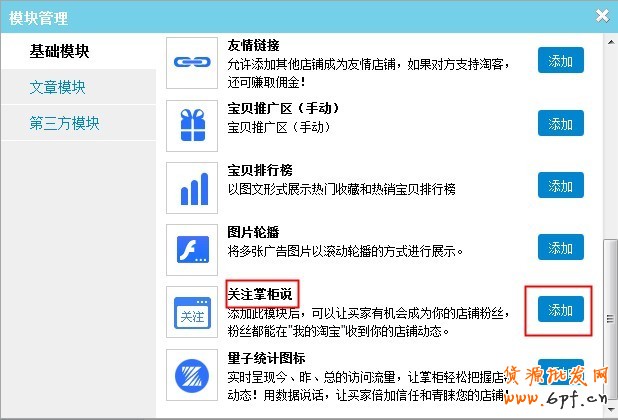 4、在“模塊管理”頁面選擇添加“關注掌柜說”