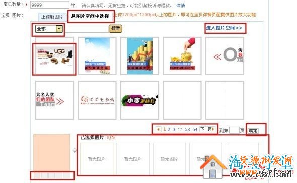 也可以從圖片空間中選擇,選擇分類,單擊一張圖片,點下方確定按鈕。如果商品有多種顏色,可以上傳多張圖,最多上傳5張,下方一排5張的,就是你選擇的圖片。點擊進入圖片空間字樣,就可以直接進去圖片空間了。