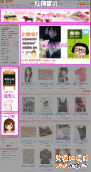圖中除了寶貝展示頁的掌柜推薦、自動推薦,粉色字體所顯示的店招、自定義區域都是可裝修的地方。