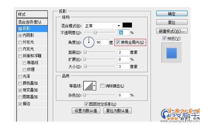 當(dāng)光源在90°的時(shí)候高光、陰影以及其他圖層效果看起來(lái)最好。為了避免重復(fù)設(shè)置,在混合選項(xiàng)中(斜面和浮雕、內(nèi)發(fā)光和陰影)勾選使用全局光。
