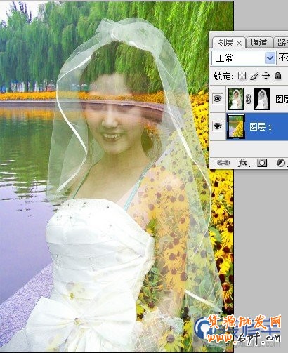 回到圖層,在圖層下面加一個背景來觀察:發現什么了?我們只摳出了透明部分,也就是紗的部分,而人物被蒙版給透明了。