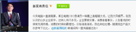 京東蘇寧價格戰開始第一天下午,中國新蛋網COO池勇信忍不住在微博上吐槽稱“某位電商CEO像演員一樣戴上高帽唱大戲,讓我大開眼界”,并列出了若干產品價格對比,聲稱參與價格戰的電商產品反而比新蛋網更貴。有網友評論稱此舉是暗諷京東蘇寧,也有網友稱這是新蛋在“搭車做廣告”“跟風炒作”。