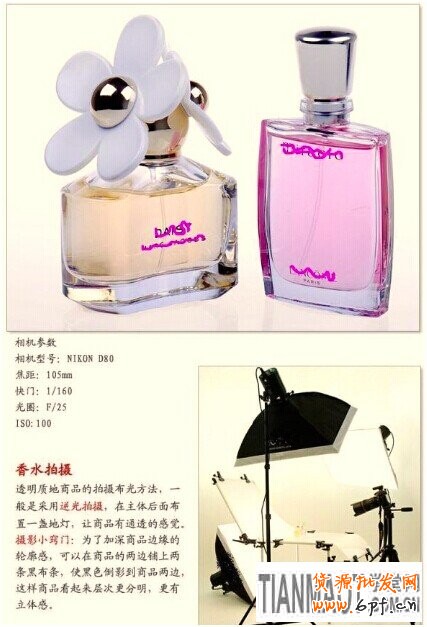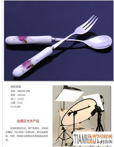 這張圖片里介紹了容易產生高光和鏡面反映的拍攝技巧:用一張黑色卡紙,中間挖個小洞,套在鏡頭上,還有用柔光紙圍在商品周圍,做全隔離的布光方法。