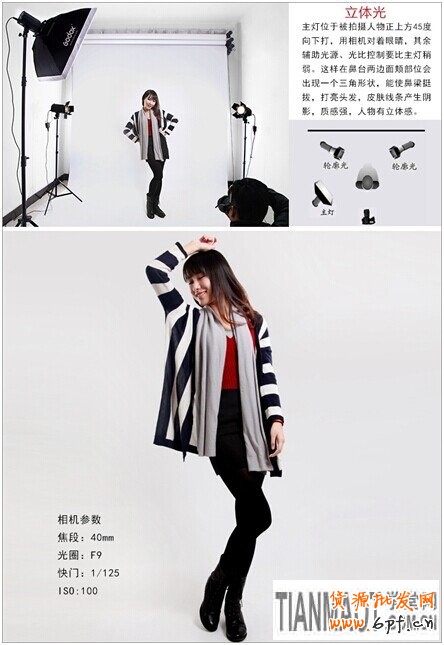 上面這三張圖片是通過不同的布光技巧:“全白背景布光”、“立體光”、“大平光布光”拍攝出來的不同效果的模特圖片。