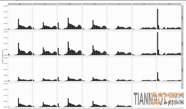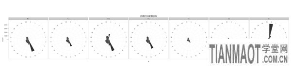 上圖是某店鋪全年間周一至周日(不算雙11和雙12),24小時各時段的購買行為分布,可看出周一到周日的黃金時期。在2013年里,這位賣家周一、周三、周四與周日的生意最好,而周一、周二與周四的黃金時段是早上10點,周三的黃金時段是早上10點與凌晨零點,周日的黃金時段是凌晨零點。