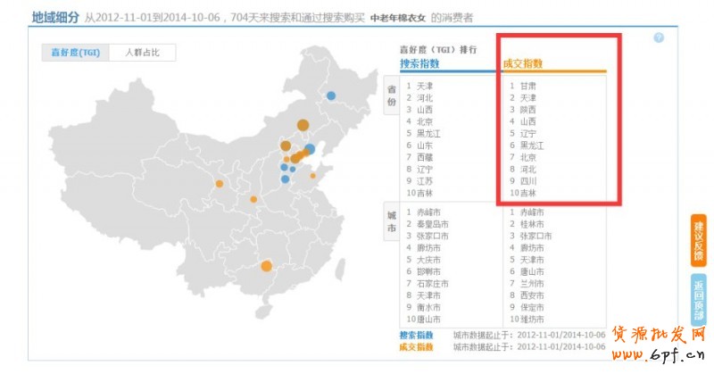 再從上邊這張圖,我們可以看出,中老年女裝主要成交客戶群體是在甘肅天津一帶,那么投入直通車或者鉆石展位時,區域投放可以選擇這些地區的人群,因為這些地區的人群是我們最大的潛在用戶。