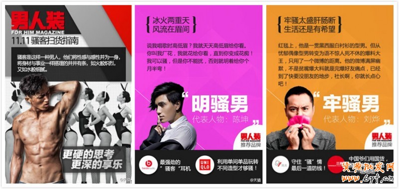 這還不夠,天貓又來個@男人裝,列出了五種代表性的“騷客”,讓人們來站隊?騷客出世,潮爆暖男。男生你是哪一種?女生你最愛哪一款?自己站隊,攻略拿好。