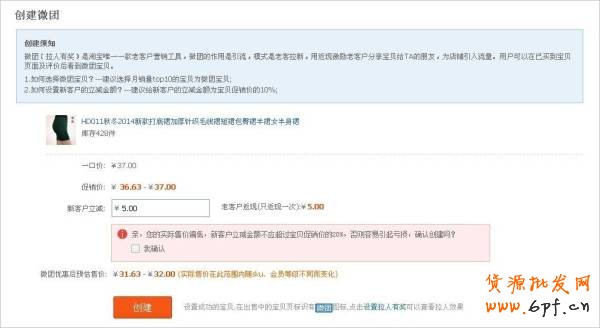 新客戶享受的折扣是通過(guò)發(fā)放微團(tuán)專用的寶貝優(yōu)惠券的方式實(shí)現(xiàn)的,設(shè)置金額不應(yīng)高于寶貝促銷價(jià)的20%,如果超過(guò)則需要二次確認(rèn)方可提交。