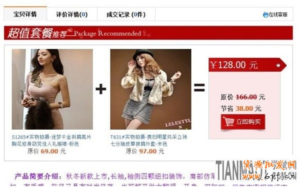 5、搭配套餐。多個寶貝搭配一起銷售打折促銷,提高店鋪的銷量,通過設(shè)置店鋪中2個寶貝搭配一起銷售更優(yōu)惠的功能。如,設(shè)置一件裙子和一件披肩外套一起買的話可以減38元,這樣的促銷方式是否也很有力度了。