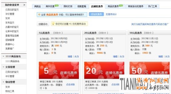 登陸自己PC店鋪后臺創建,點擊【促銷管理】——>選擇【店鋪優惠劵】,再進入優惠劵的設置,如下圖