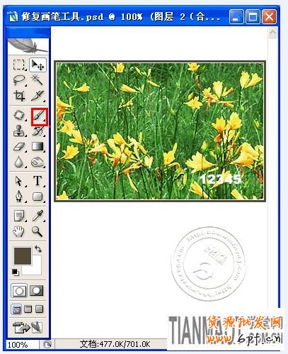 修復(fù)畫筆工具的操作方法與仿制圖章工具相似。按住Alt鍵,在無文字區(qū)域點(diǎn)擊相似的色彩或圖案采樣,然后在文字區(qū)域拖動(dòng)鼠標(biāo)復(fù)制以覆蓋文字。修復(fù)畫筆工具與修補(bǔ)工具一樣,也具有自動(dòng)匹配顏色的功能,以達(dá)到和周圍顏色混合的效果,可根據(jù)需要進(jìn)行選用。如下圖: