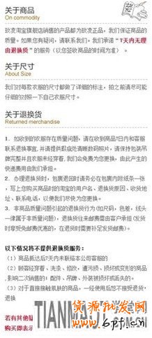 首先,描述頁面本身分為兩塊:圖片展示設計和功能效果設計。對商品的展示上,圖片排版要有序,圖片成列并不是越大越好,賣家要利用最少的空間展現出最合理的圖片。同時,運用圖文結合的形式,在呈現圖片的同時標以文字介紹,讓買家更加了解商品。在介紹商品的效果上,文字不易過多,過多的文字容易讓買家感覺到厭煩,所以在文字較多的情況下,千萬要注意文字的排版,切勿把所有文字不做處理的直接呈現給買家。有一個技巧就是,在對一些有功能效果的產品做表述時,多一些前后對比的圖片,同時展現商品的特點優勢。