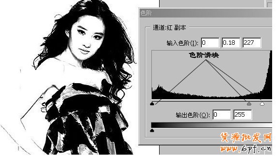 在PS中打開圖片素材(圖1.1),點開通道面板(1.2),選取發絲部分與背景反差最大的通道(此圖當中,發絲部分與背景反差最大的通道為紅色通道),鼠標左健點擊紅色通道選中它,將此通道拖到下方復制通道按鈕上,復制另一個紅色通道副本(1.3)。選中復制的紅副本通道,鍵盤CTRL+L打開色階對話框,不斷調整色階滑塊,直到發絲的灰色部分接近變為黑色,然后確定,此步驟的目的是使發絲部分與背景反差加大(圖1.4)。