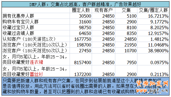 若你用DMP圈定了多個人群,想知道這些人群的精準度如何,把這些人群與現有客戶交集,然后計算前面提到的比例(已圈定的人群可以在修改那繼續增加新標簽現有客戶)。把所有人群比例統計出來,你將一目了然看出這些人群哪個精準度最高,哪些可以重點投放,哪些需要大流量時才需要投放。現有客戶越多的店鋪,得到的精準度越準確,越具有參考價值!