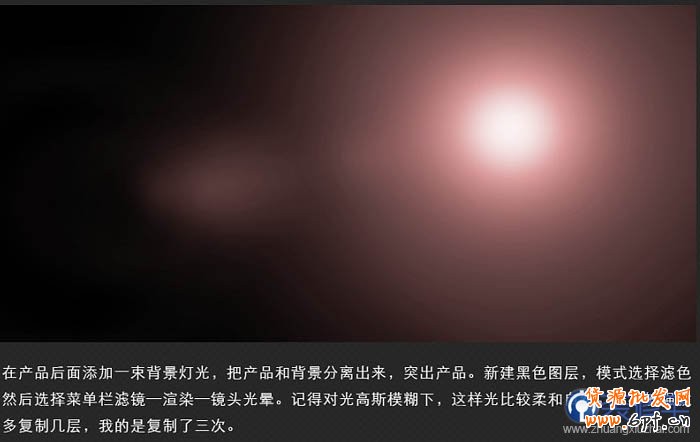 8、在產品后面添加一束背景燈光,把產品和背景分離出來,突出產品。新建黑色圖層,模式選擇“濾色”,然后選擇菜單:濾鏡 > 渲染 > 鏡頭光暈。記得對光高斯模糊下,這樣光比較柔和自然。光不夠強就多復制幾層,我的是復制了三次。