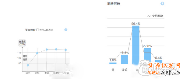 如上圖所示,是搜索鏡子這個關鍵詞后得到的人群消費層級和買家等級,從圖中可以看出,中等層級的新手占比還是比較多的,因為一般新手都不會購買單價太高的產品,這也比較符合我們店鋪的價格定位。