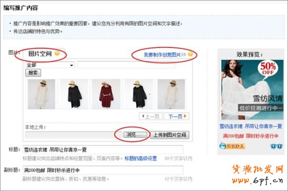您可以選擇圖片空間里的創意素材,也可以本地上傳創意圖片,或者進入廣告牌在線設計平臺(bannermaker)挑選模板創建創意圖片;填完完畢后,你可以設置推廣標題;