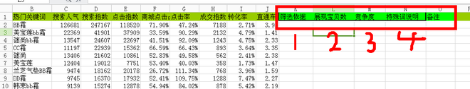 然后按照同樣的步驟按轉化率和搜索指數篩選,一定不要忘記標色和填“篩選依據”后面會用。這一步需要特別注意3點: