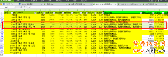 準備工作完成,接下來需要先按三個數據項單維度選出我們的數據,依次是:成交指數,轉化率,搜索指數(為什么選擇依次選擇這3個數據,大家回頭去看文章前面的優化標題的三個目的就明白,成交指數=搜索指數*轉化率,我們需要按照單一維度選擇然后再綜合分析,是不是想到了物理中的控制變量法:)2)先選中成交指數這列,按降序擴展排列,從高到低選擇你需要的詞,給整行標同樣的背景色,在“篩選依據”這列填“按成交指數”具體如下圖:
