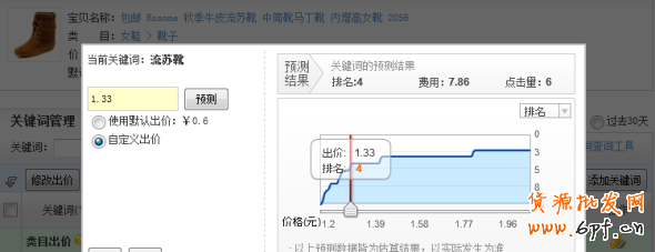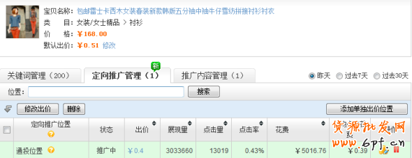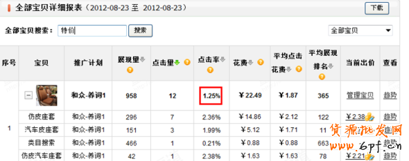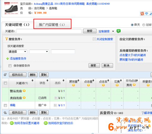 當一款寶貝的總體點擊率很高,里面的所有關鍵詞質量得分都很高。我用的方法是利用關鍵詞的點擊率,提升定向的質量得分。下面看圖: