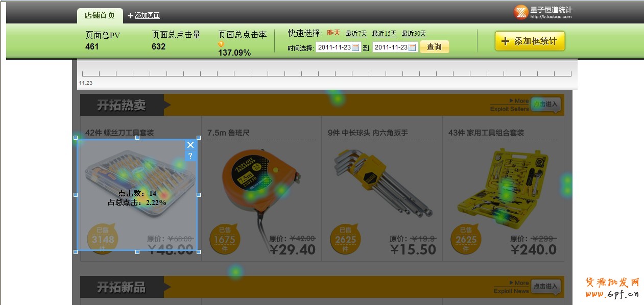 目前量子新出的網店裝修熱圖也是一個很好數據分析工具。如果到達首頁的流量不錯,那么完全可以把需要驗證的圖放在首頁的某個醒目位置,在次日觀察數據情況。如果想做對比分析,那么可以把需要做測試的主圖放在同一個區域,這樣就可以很好的鑒別出哪個寶貝圖更加吸引人。