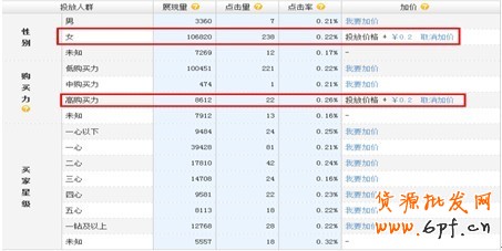 鎖定一個(gè)群體,針對(duì)性的選款。一個(gè)白領(lǐng),22-27歲左右,月收入4000以上,她們的消費(fèi)習(xí)慣,這些人不會(huì)去買20幾塊的連衣裙,幾塊錢的短袖。把人群定位好了,再分析寶貝人群性別定位,對(duì)主要購(gòu)買人群進(jìn)行加價(jià)。通投位置出價(jià)可以比較低,加大對(duì)性別的出價(jià)。分析寶貝價(jià)格定位,選擇合適的購(gòu)買力進(jìn)行加價(jià)。