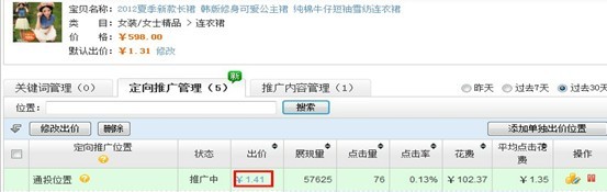 出價(jià)1.41,流量一個(gè)月才76個(gè),說明這款寶貝的定向隱性質(zhì)量得分非常低。優(yōu)化定向不能只靠出價(jià),更關(guān)鍵的是如何優(yōu)化定向的質(zhì)量得分。