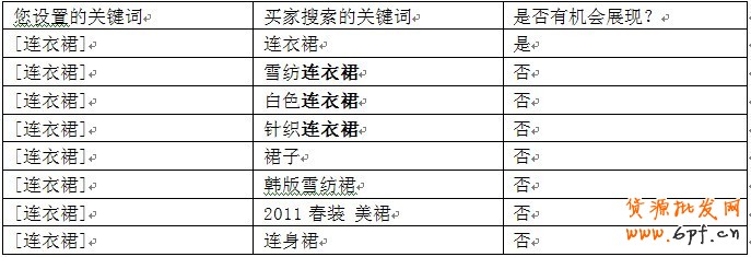 B)若您設置的關鍵詞是“連衣裙”(中心詞匹配方式)時,當買家搜索連衣裙、雪紡連衣裙、白色連衣裙、針織連衣裙,等時,因為完全包含了您設置的關鍵詞,則有展現的機會。流量較多。