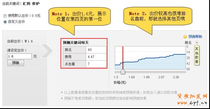 7、該關鍵詞很多人推薦的 有時我們選擇的關鍵詞是很多商家推薦的,同時展示量也很高的,排名靠前的出的價都比較 高,我們的默認出價基本上排在3、4頁;這種狀況我們也沒必要去爭第一頁的展示位,選擇 在第三、四頁的最佳位置出現也還是很不錯的。 例如同樣是“匯利 炸爐”這個關鍵詞,我們之前出價是5元,排名是第9名,這個代價太高了 哦;我們把出價降到1.6元,排名是40名,展示位在第四頁第一位;出價比較多的,說明這 個產品是比較多商家賣也比較熱賣的,因此我們在第四頁同樣有效果。