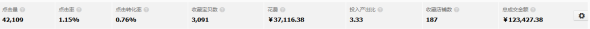 從這張簡單的數據截圖當中,我們可以看出:1個月的點擊量在2萬多,平均每天點擊量不到1K,PPC在1塊左右,相當于每天花費1K左右,ROI在1.11,點擊轉化率0.32%,收藏成本:15.4元。
