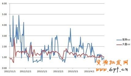 從上面兩幅數據可以看出,從2012年11月份開始,寵物類目點擊率ctr長期保持在1%--5%之間,ctr遠高于大盤整體數值。而在投入產出的roi(支付寶成交金額/鉆展消耗)也保持在1--5之間,遠高于大盤整體數值。
