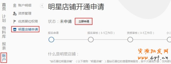 1、登錄鉆展后臺http://zuanshi.taobao.com,后臺賬戶 -> 明星店鋪申請 -> 立即申請