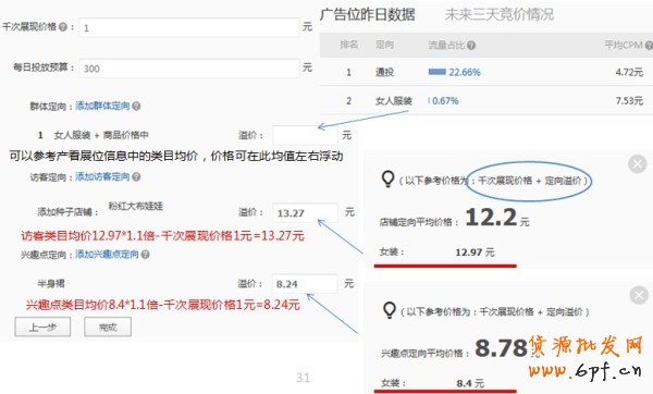 系統提示的類目出價*1.1倍-千次展現價格(千次展現價格建議設置成該展示位最低千次展現價格,遵循高溢價,低千次展現價格,流量更加精準);